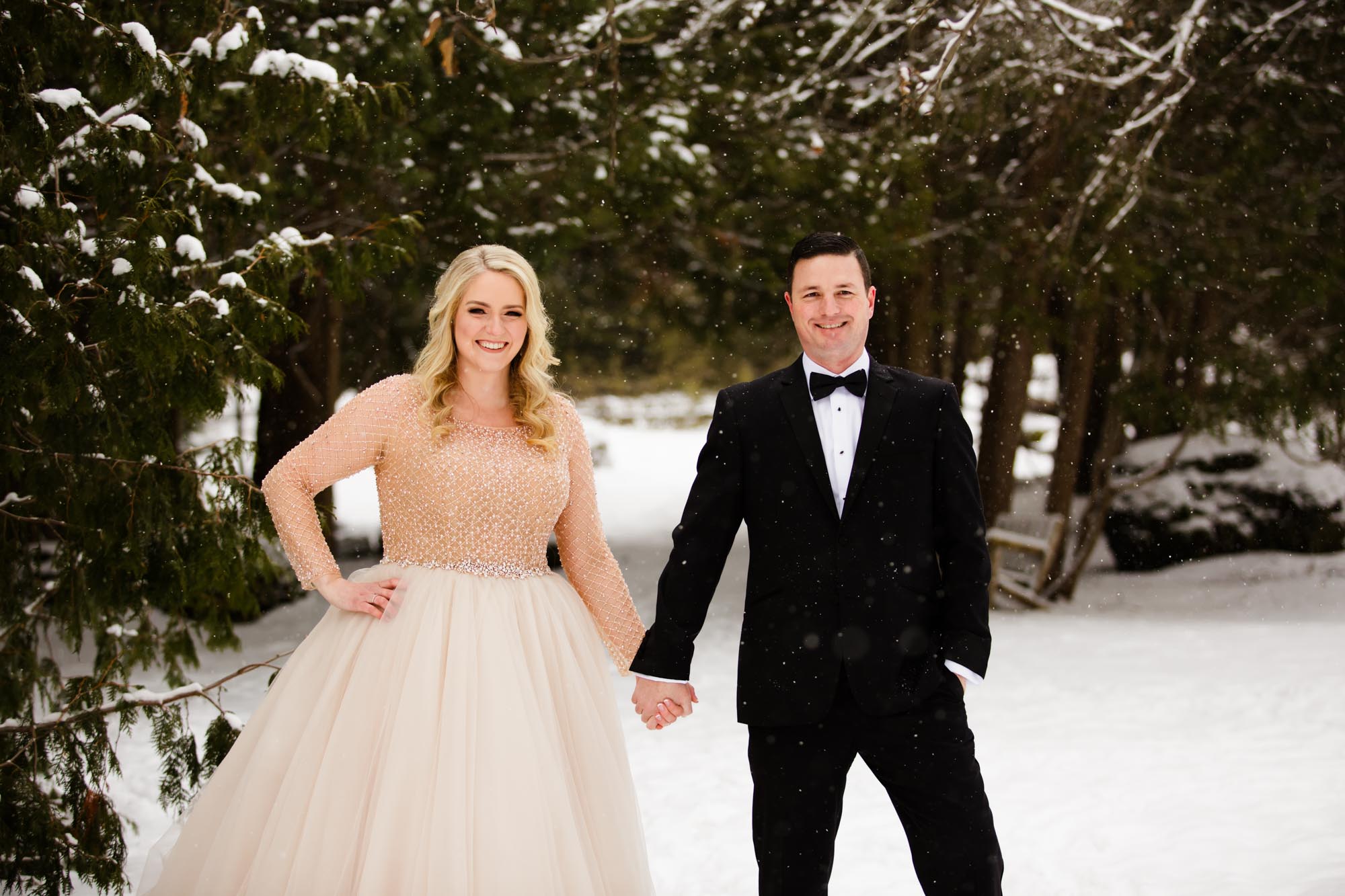 Brandon waited patiently outside, as the snow gently fell, until Calla approached him with a small tap on the shoulder. It was a beautiful moment. We love how first looks give a couple the chance to get a sneak peek of their partner on the wedding day! The snow continued to fall, creating a picturesque winter wonderland scene, as we explored a small area of the Millcroft Inn grounds.