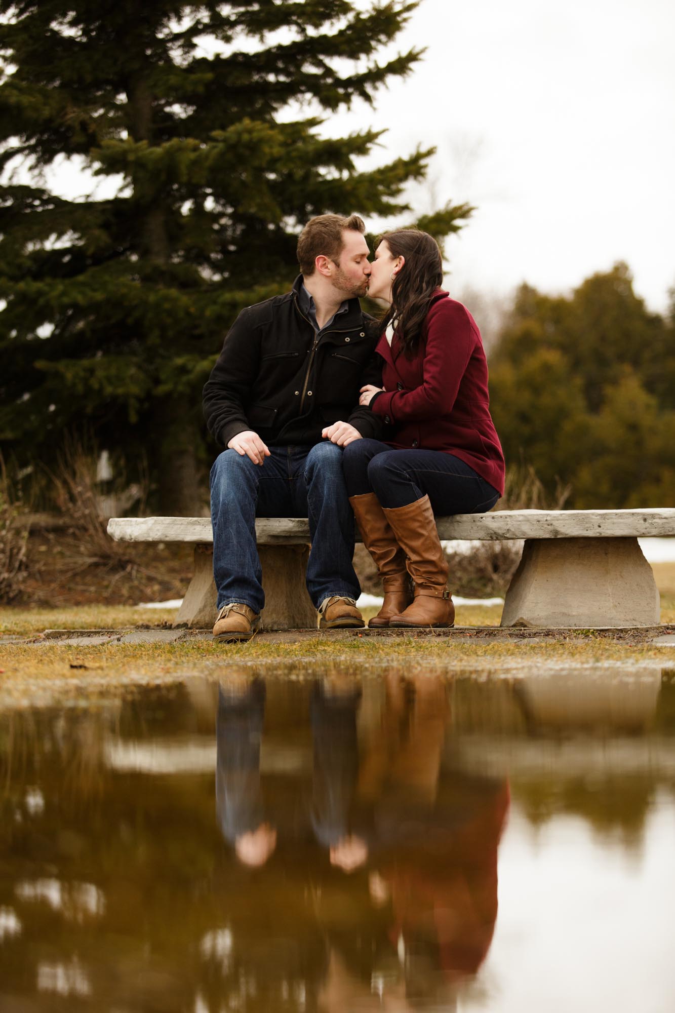 It was a beautifully warm, winter day. The area was abuzz with activity, as many people were taking advantage of the ideal conditions. We strolled along the brick-lined streets of the village, as Sarah + Mark enjoyed the scenic sights of the tourist town. We made our way over to the base of the mountain and borrowed a hand-picked snowboard from the rental kiosk (Sarah loves snowboarding!). After a few photos with the board, we headed over to Sunset Point and downtown Collingwood to finish the session.