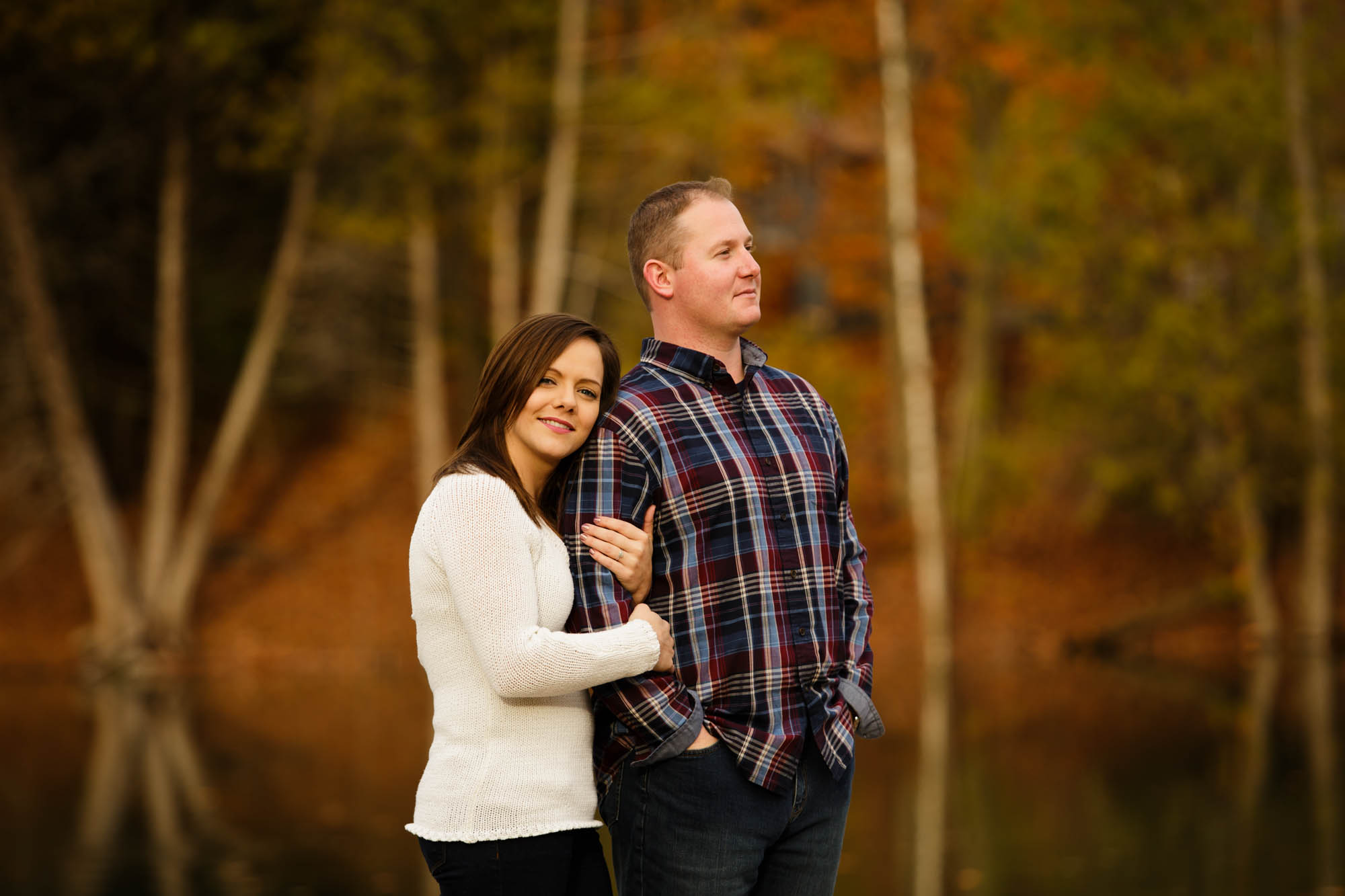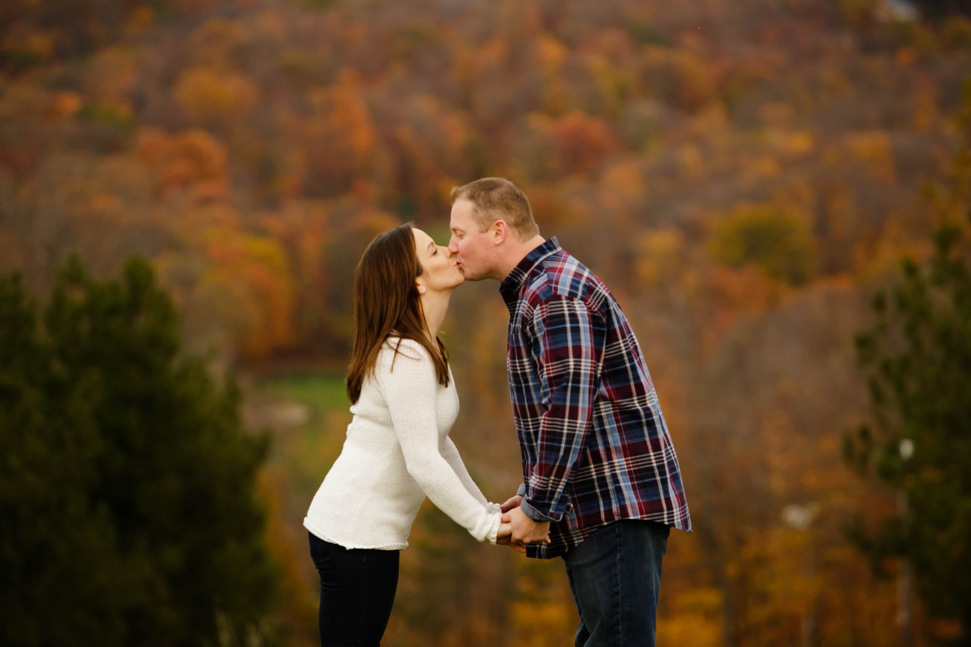 Meet Shannon + Chris. When we first met Shannon + Chris to discuss their wedding, we instantly knew we liked them! They are so great at making each other laugh. Plus, they both love to joke around and have a good time, which made their engagement session super fun! We all decided it would be at great idea to do their portrait session at Horseshoe Resort (where they will be celebrating their wedding next year). Oh, how we love it there! All week long, the forecast called for a wet and chilly day; however, when we arrived, it couldn’t be a more perfect autumn day for photos! We toured around the area to a few spots at the base of the mountain, then drove up the hill to their future ceremony location. What an amazing view! We can hardly wait for their big day. It’s going to be beautiful!